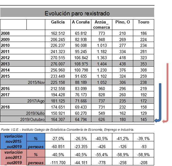 Que coa mellora económica xeral, sen necesidade de ter o proxecto mineiro en marcha, o paro foise reducindo en ambos concellos e na comarca de Arzúa, porcentualmente incluso máis que o total galego. De maneira que nos nosos concellos hai hoxe prácticamente a metade de parados rexistrados que había no 2013, no peor da crise. Entre ambos uns 400 parados menos, 258 no caso de O Pino, e 208 no caso de Touro.