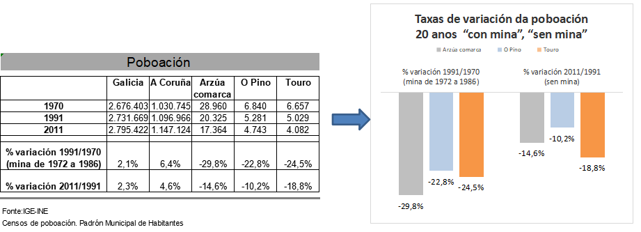 Non temos máis que recurrir á historia recente: nos 20 anos que van de 1970 a 1991, nos que a mina de Riotinto estivo en funcionamento de 1972 a 1986, a perda de poboación é máis acusada (-29,8% para a comarca de Arzúa, -22,8% para o concello do Pino e -24,5% para o concello de Touro), que nos seguintes 20 anos, de 1991 a 2011, nos que xa non estaba a mina (-14,6% para a comarca de Arzúa, -10,2% para O Pino e un -18,8% para Touro).