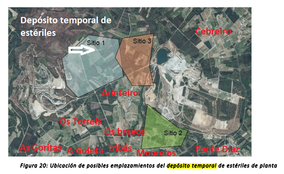 Dada la presencia de huecos mineros con características idóneas para el almacenaje de los residuos mineros generados durante el tratamiento del mineral, solo será necesario construir un depósito de estériles temporal convenientemente impermeabilizado, que estará activo durante el periodo mínimo indispensable hasta tener habilitados los huecos mineros de Vieiro y Arinteiro como depósitos de estériles”