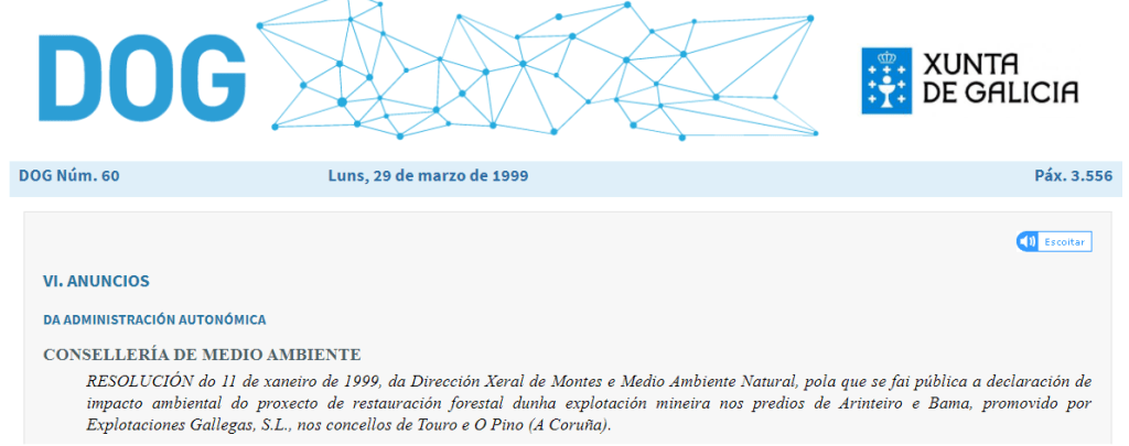 extracto do DOG de 1999 no que se publicaba a DIA favorable
