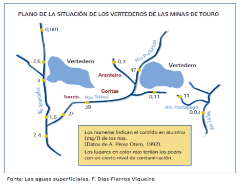 Nesa época a situación dalgúns ríos e regatos da zona é crítica, queda patente en moitos estudos deses anos, por exemplo na tese doutoral de Angel Pérez Otero de principios dos anos 90 (Caracterización de los suelos de mina e impactos ambientales de la explotación de sulfuros metálicos de Arinteiro (La Coruña). Autor: Angel Pérez Otero. USC.1992) na que se evidencian grandes concentracións de aluminio como consecuencia da extrema acidez das augas.