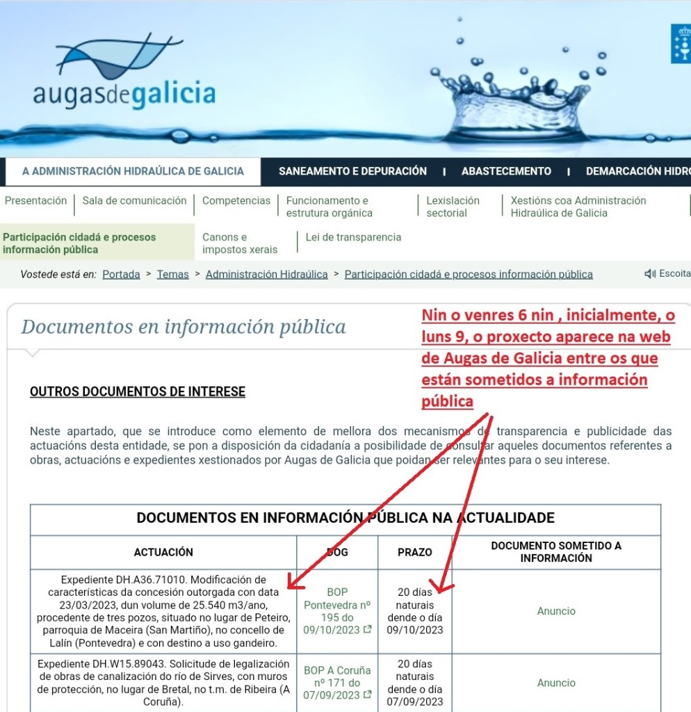 O DOG indicaba o consabido prazo de 30 días dende o día seguinte ao da publicación (o venres 6) e remitía a a páxina web de Augas de Galicia para que calquera persoa interesada puidese consultar a información….pero nin o venres 6, nin os seguintes días, esa documentación foi posta a disposición da cidadanía, mentras o xa escaso prazo estaba transcurrindo.