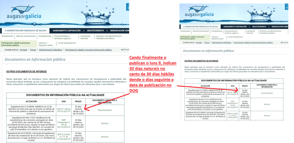 Cando o luns 9 se chama a Augas de Galicia, e tras peregrinar por distintos teléfonos, maniféstasenos “sorpresa” porque a documentación non esté onde debería, e indícasenos que ao longo da mañá tratarán de remedialo. É máis, houbo que chamar novamente porque nun primeiro momento publicaron restrinxindo o prazo a 30 días naturais, no canto de 30 días hábiles.