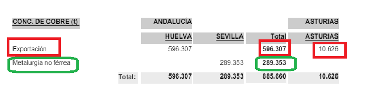 Novamente, a pretendida necesidade dunha Europa máis autosuficiente en materias primas serve de xustificación para vender como imprescindibles (estratéxicos) estes proxectos. España sitúase nos primeiros postos entre os países produtores de cobre a nivel Europeo (2º-3º, tras Polonia) segundo os datos da Estadística Minera publicada polo Ministerio de Transción, no 2021 (último ano dispoñible). Porén, grandes cantidades dese “concentrado de cobre”, que se produce a pé de mina e contén entorno a un 20-25% de cobre metal, exportouse como materia prima para ser procesado en metalúrxicas extranxeiras, principalmente en China .