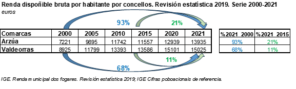 E facemos ben. Se analizamos a evolución da renda dispoñible por habitante na nosa comarca nestas dúas últimas décadas, atopamos que na comarca Arzúa prácticamente se duplicou nestes 20 anos (93% de crecemento), mentras que Valdeorras se sitúa nun 68%. E a tendencia estase acentuando nos últimos anos: dende o 2015 Arzúa medrou un 21% e Valdeorras un 11%. E iso coas explotacións pizarreiras abertas… nas rexións mineiras a crise verdadeira ven cando se esgota o recurso.