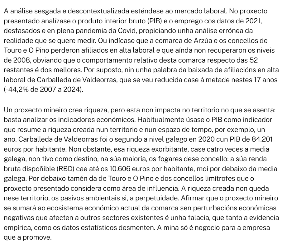 Seguimos! Este proxecto non favorece a xente nin o territorio, tampouco no plano económico, como demostra a evidencia do sucedido no noso pasado e o que está a suceder na nosa contorna: lonxe da riqueza prometida, as comarcas mineiras teñen un declive demográfico máis acusado e a renda dispoñible dos habitantes do territorio é inferior. Así se pon de manifesto no artigo que estes días se publicaba na prensa, no que se confrontaba a visión dunha compañeira nosa e a dunha persoa ligada ao proxecto mineiro. Convidámoste a ler ambos aquí.