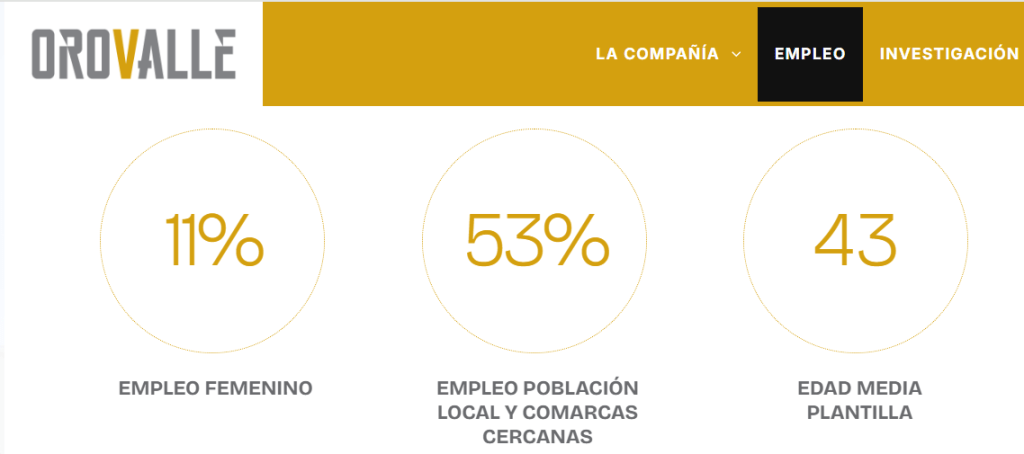 A minería é un sector que ofrece poucas oportunidades laborais as mulleres. E poucas tamén aos traballadores e traballadoras de máis de 50 anos, apenas un 20% do total segundo os datos que aporta Atalaya Mining nese mesmo informe de 2023. Miremos onde miremos, as empresas mineiras seguen ese perfil. Por exemplo, Orovalle, a empresa que explota a mina de ouro e cobre de El Valle-Boinás en Asturias (Belmonte de Miranda), informa na súa web dun 11% de emprego feminino e unha idade media de 43 anos.