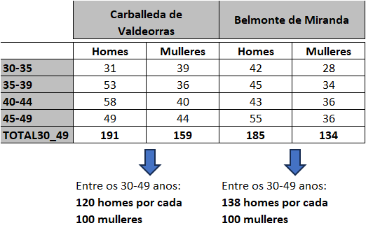 Un maior éxodo de mulleres en busca de oportunidades laborais é común aos municipios pequenos e rurais: segundo un estudo do Ministerio de Agricultura, Pesca y Alimentación, do que se facía eco este artigo, a poboación en idade activa entre os 30 e os 49 anos na España rural é de 111,7 homes por cada 100 mulleres. Pero sectores moi masculinizados como a minería acentúan o problema, en Carballeda de Valdeorras hai 120 homes por cada 100 mulleres nas idades comprendidas entre os 30 e os 49 anos. E en Belmonte de Miranda 138 homes por cada 100 mulleres neses grupos de idade. Ambos concellos presentan ratios de masculinidade moi superiores á media global indicada no estudo do Ministerio